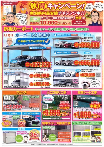 2025年秋得! 2025年9月20日 お知らせ 2025年9月22日(月)より 秋得キャンペーン! 新潟県内最安値チャレンジ中!! カーポート・外構工事ご契約の方全員に商品券¥10,000プレゼント😉 住宅省エネ2025キャンペーン 最終受付スタート! […]