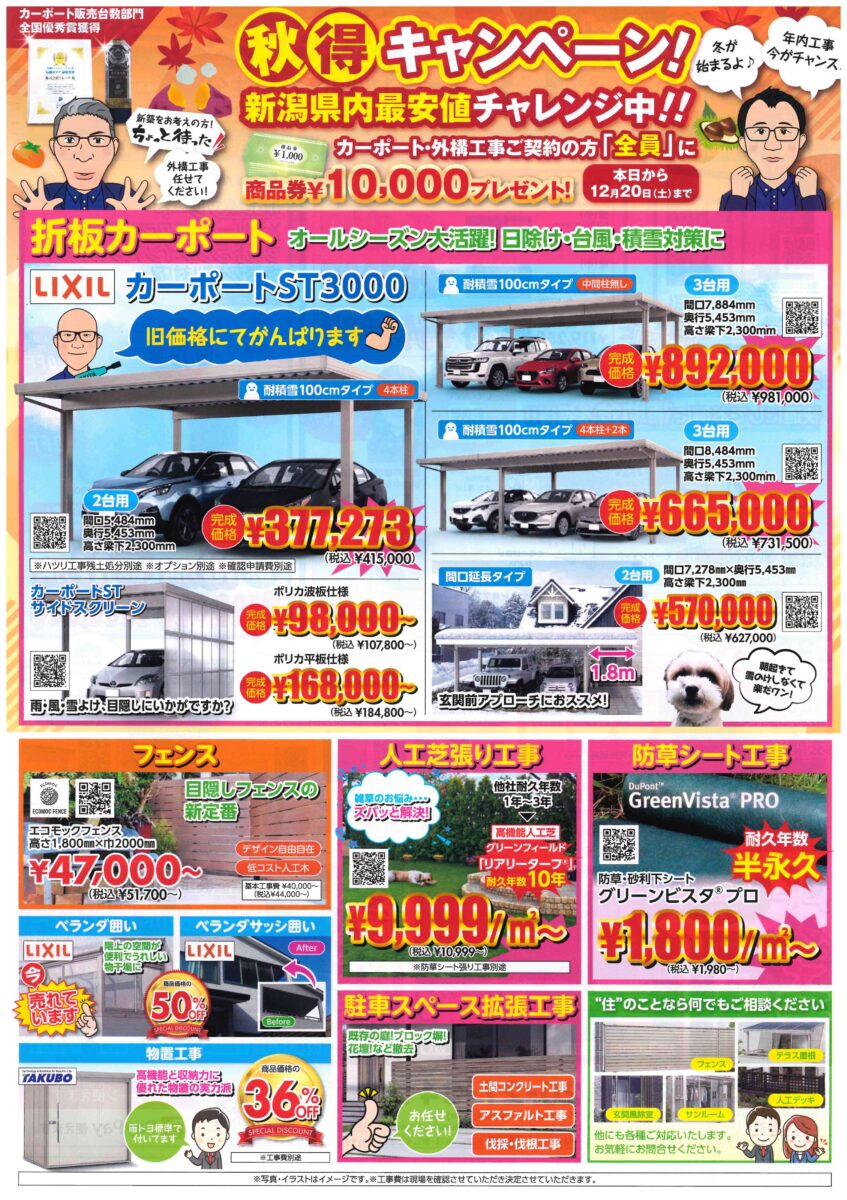カーポート・外構工事ご契約の方全員に商品券¥10,000プレゼント😉